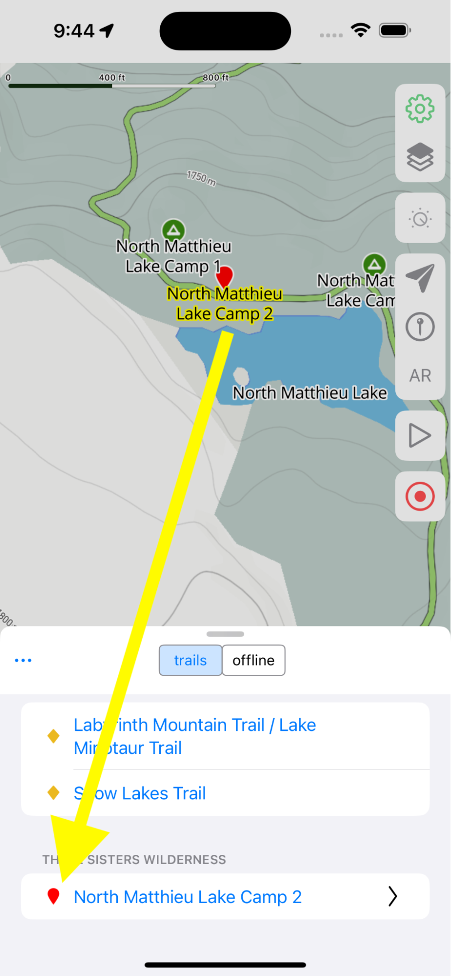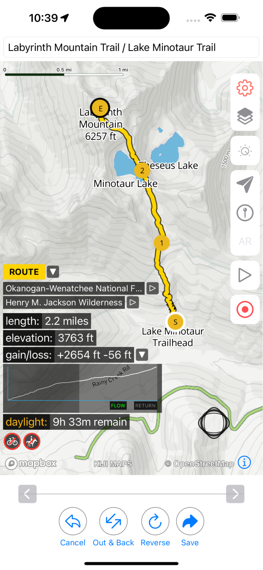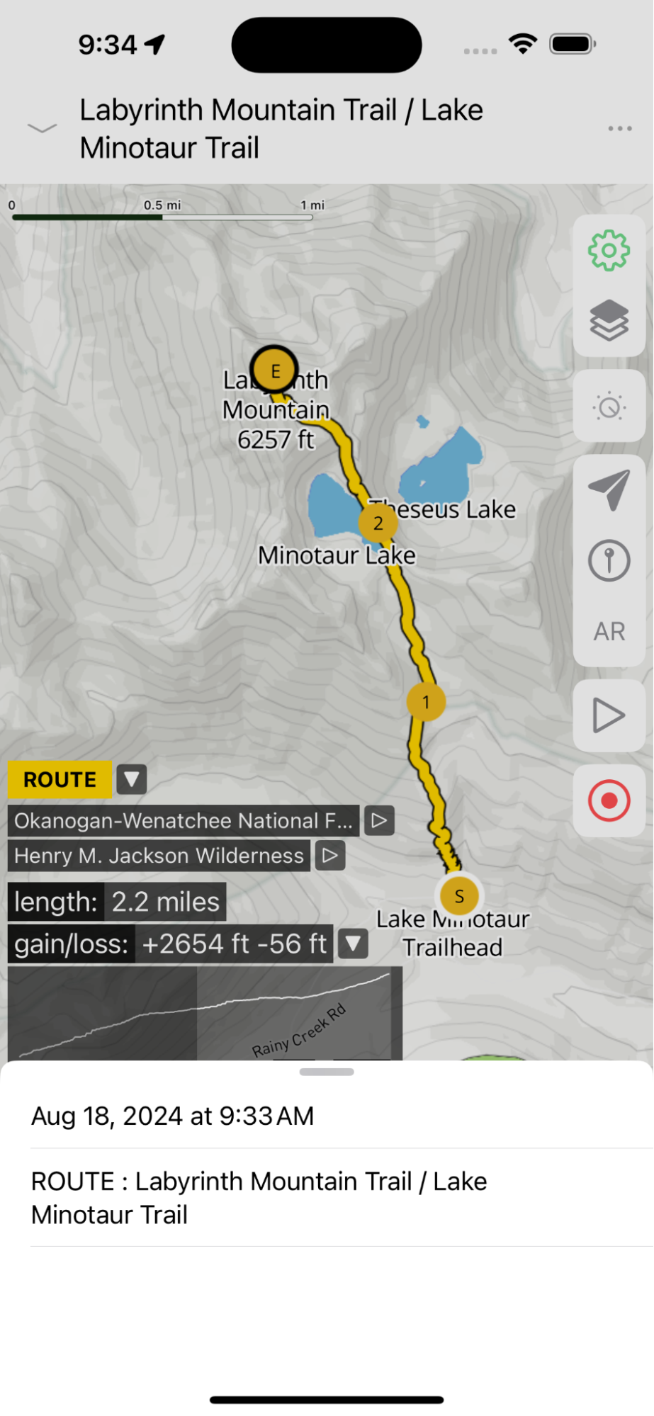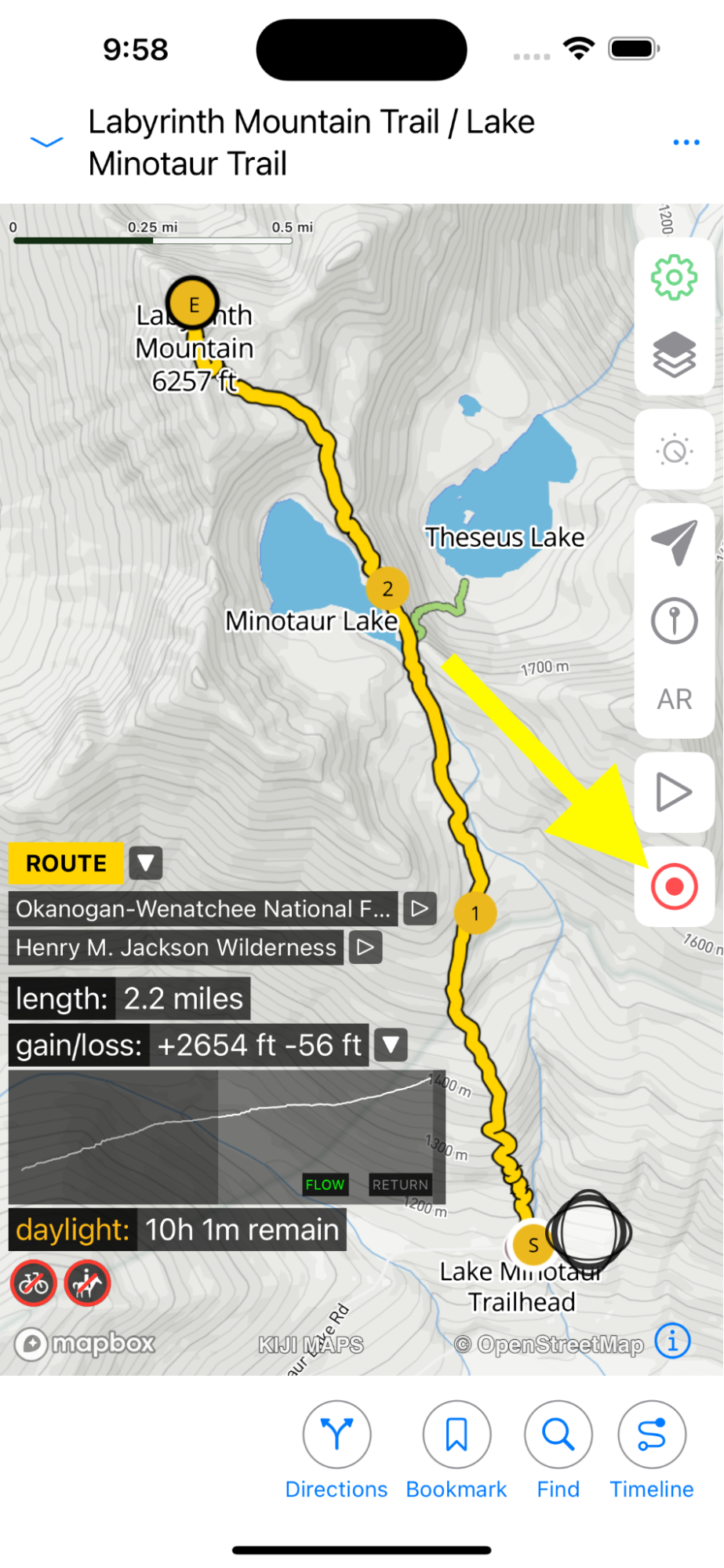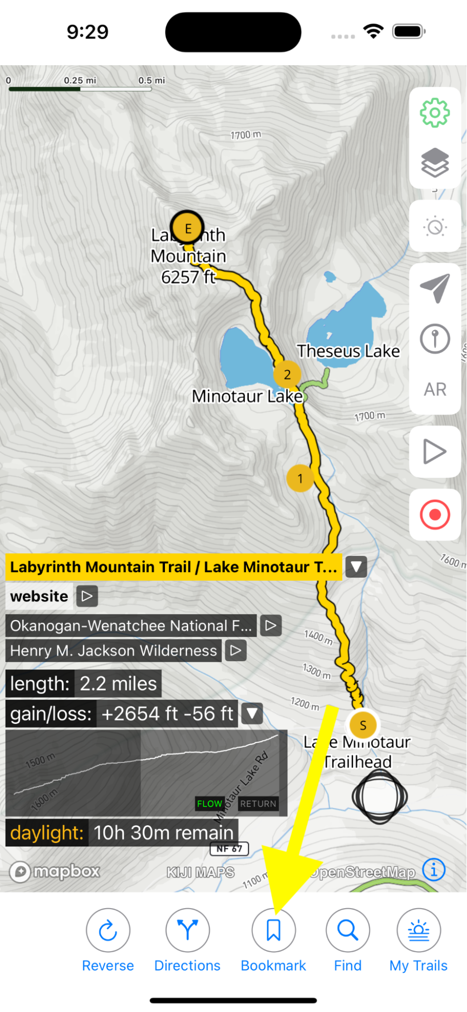If you tap the "Bookmark" button after creating a route it will be saved to My Trails and the view will switch to a detailed view of the route. In the detail view you can edit the route, follow the route by tapping record, see previous recorded tracks, add additional routes (for multi day trips) etc