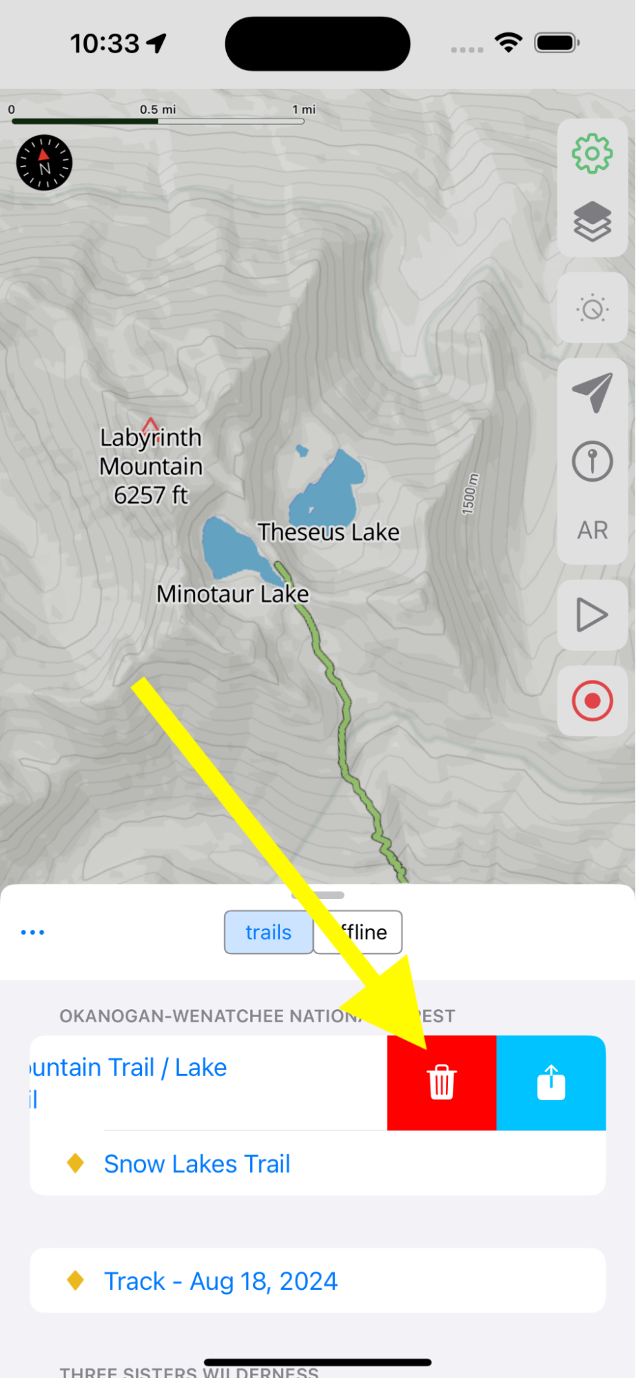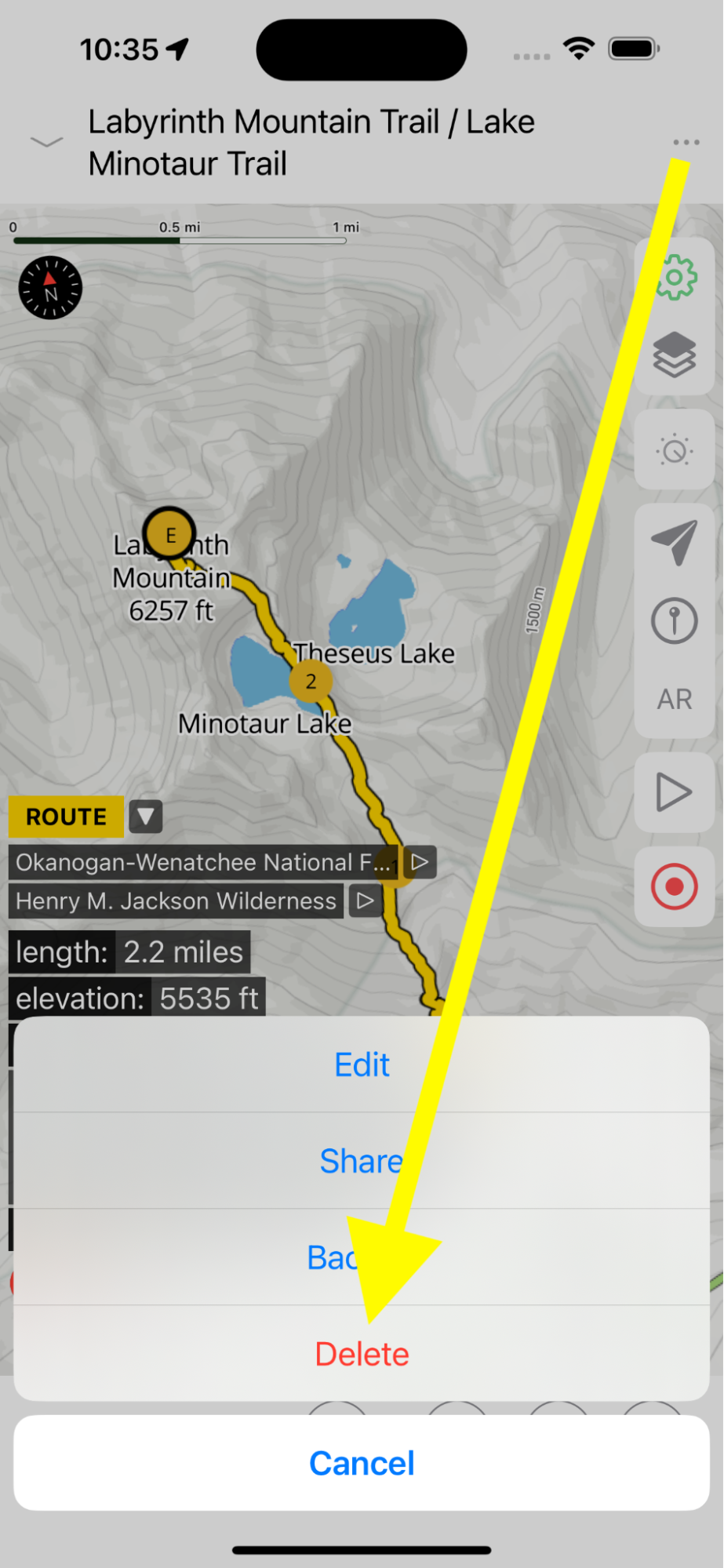 Delete RouteYou can delete a route either from My Trails or the detail view. Note: once a route is deleted it is gone forever. If you want to preserve your routes and tracks use the Backup feature to save it to reliable storage (say) on Dropbox. |