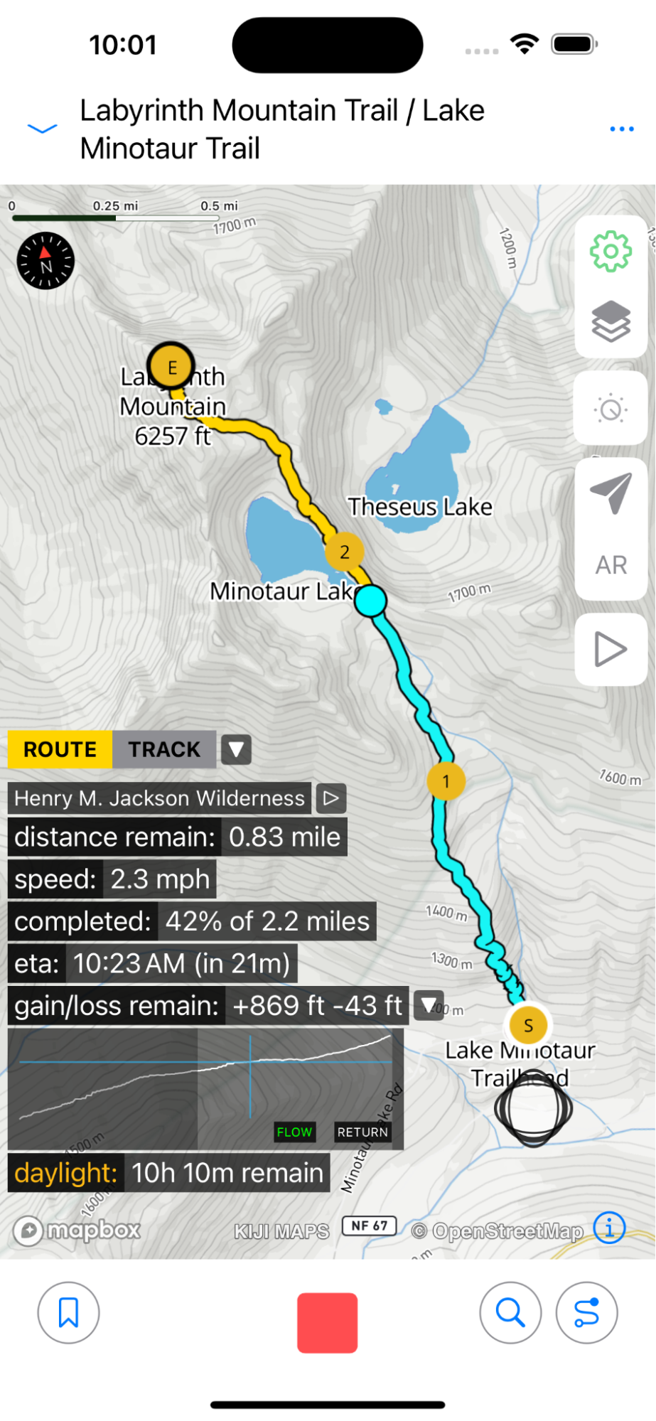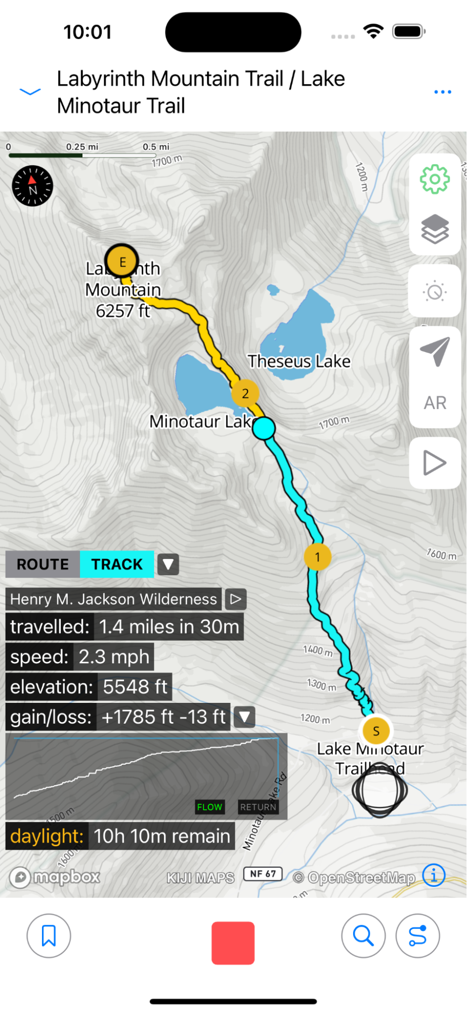 After a route has been created you can tap the "Record" button and the app will start recording your location. The stats will show relevant details like distance, speed, gain/loss etc.
