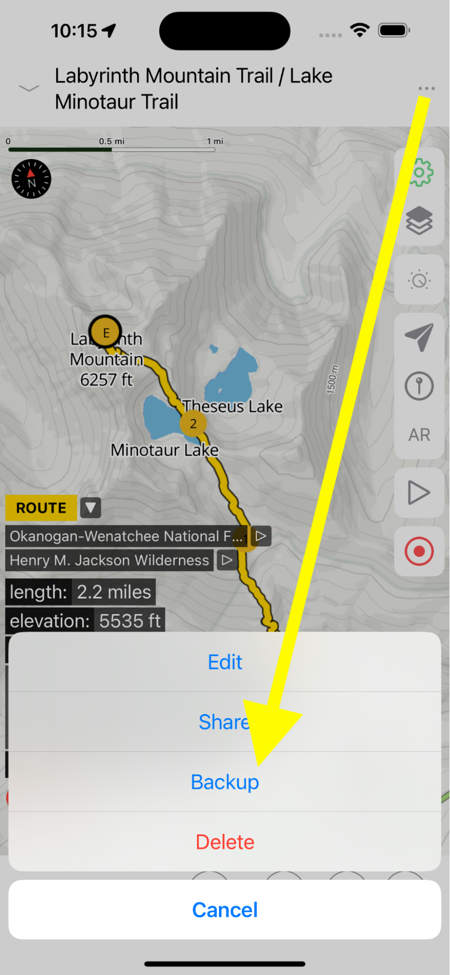 Your route will be converted to a .GPX file which you can either send to someone via email, airdrop etc. To backup the route on your device or to a storage provider eg Dropbox use the “Backup” button instead. The backup option will preserve all information to allow a complete recovery of the route (even after deletion)