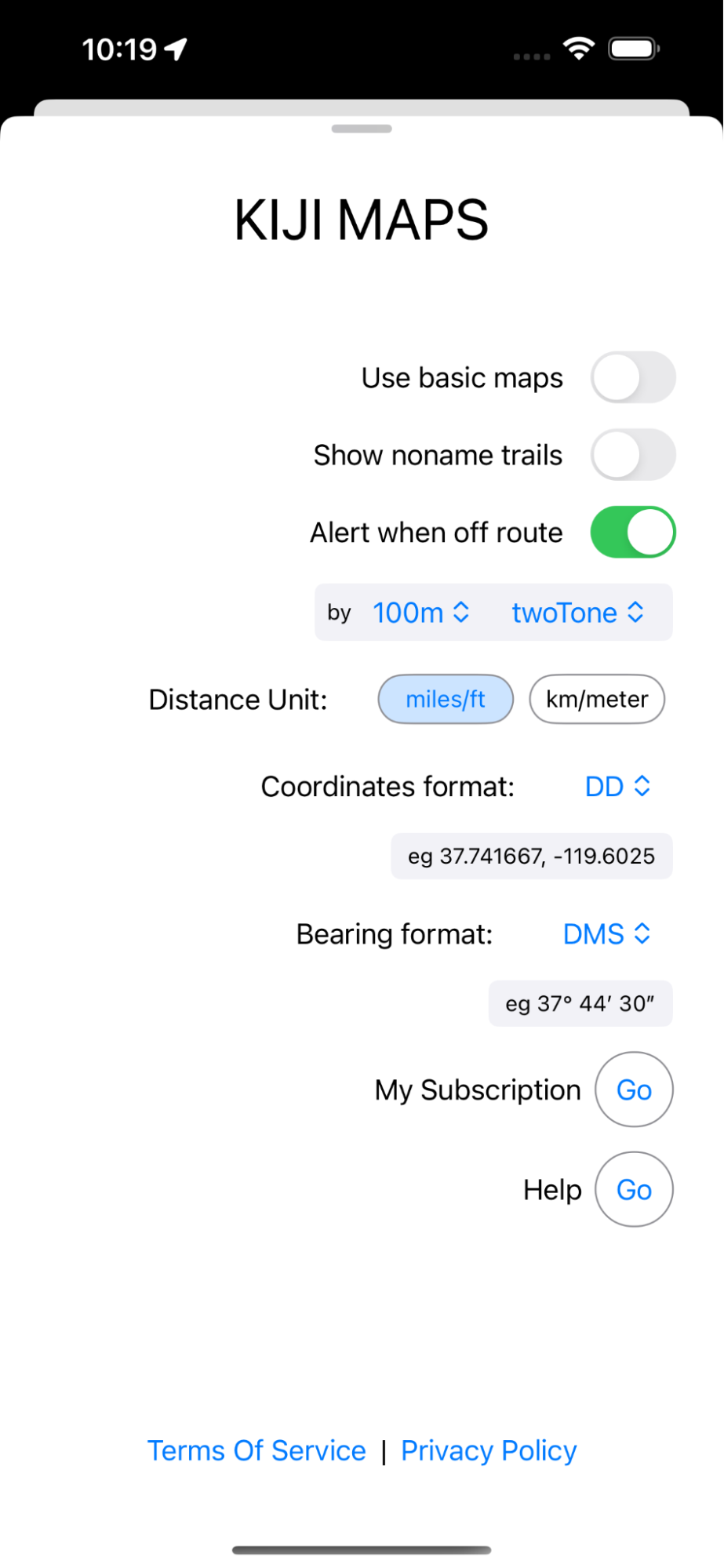 SettingsShow noname trails By default the map only shows named trails. Enable this to show all trails. Use basic maps By default the map uses Mapbox maps. Turn this on to use a simpler map. Alert when off route When you are following a route the app will notify you if you go off route. You can disable this feature here. You can also temporarily disable this in the recording menu. Distance Unit Choose the distance units you prefer eg miles/ft or km/meter Coordinate/Bearing format Choose your preferred format for coordinates and bearing. My Subscription Check your subscription status |