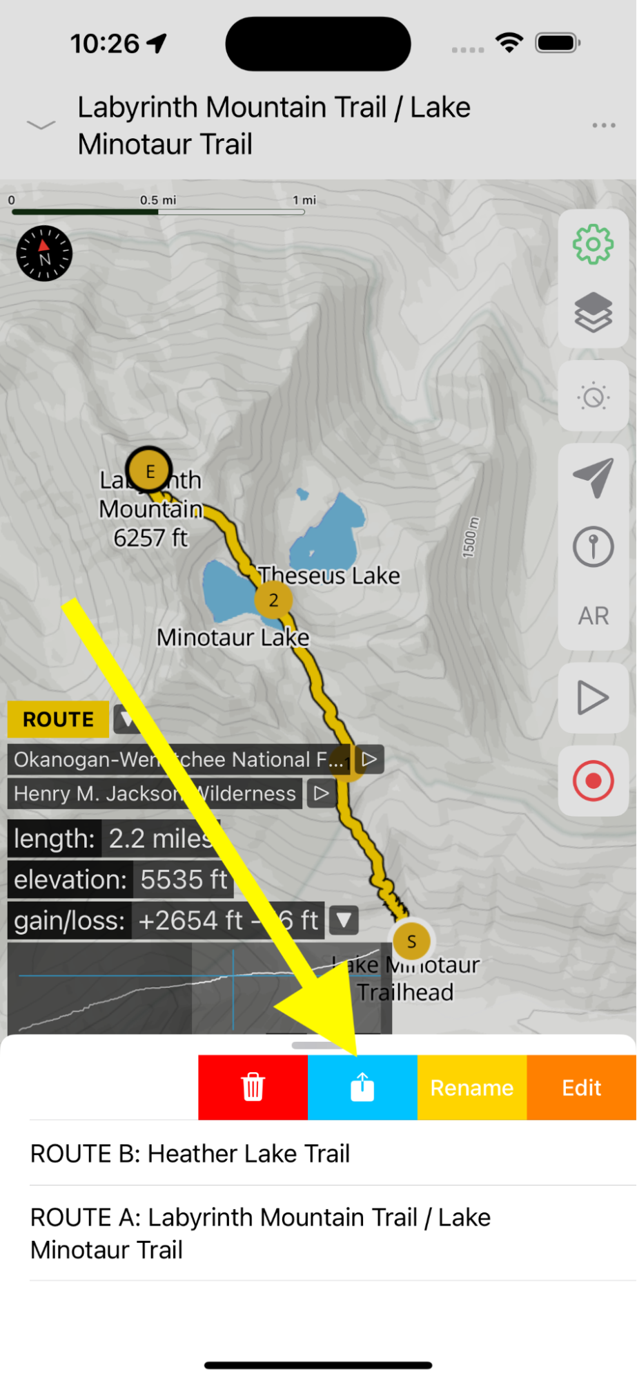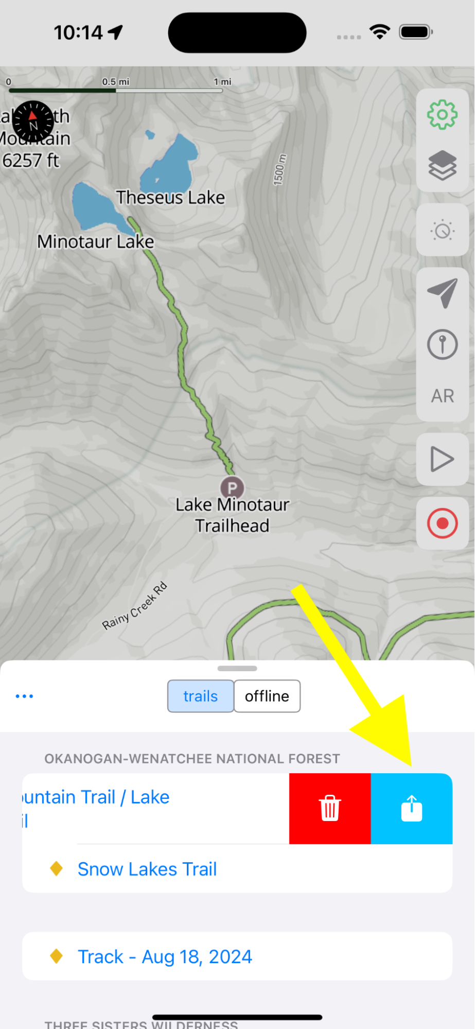 To share a route you can tap the “Up arrow” button either in My Trails or Timeline.
