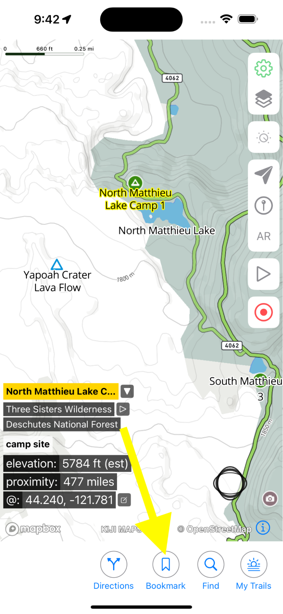 Whenever you have a map element selected, you can save it by tapping the “Bookmark” button.