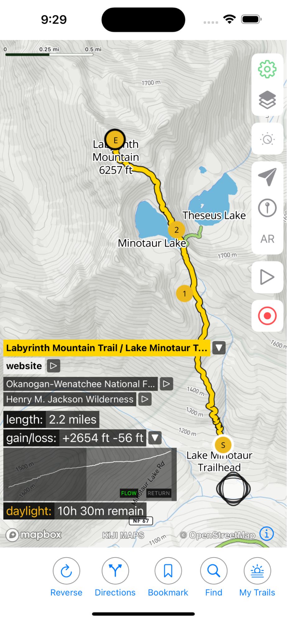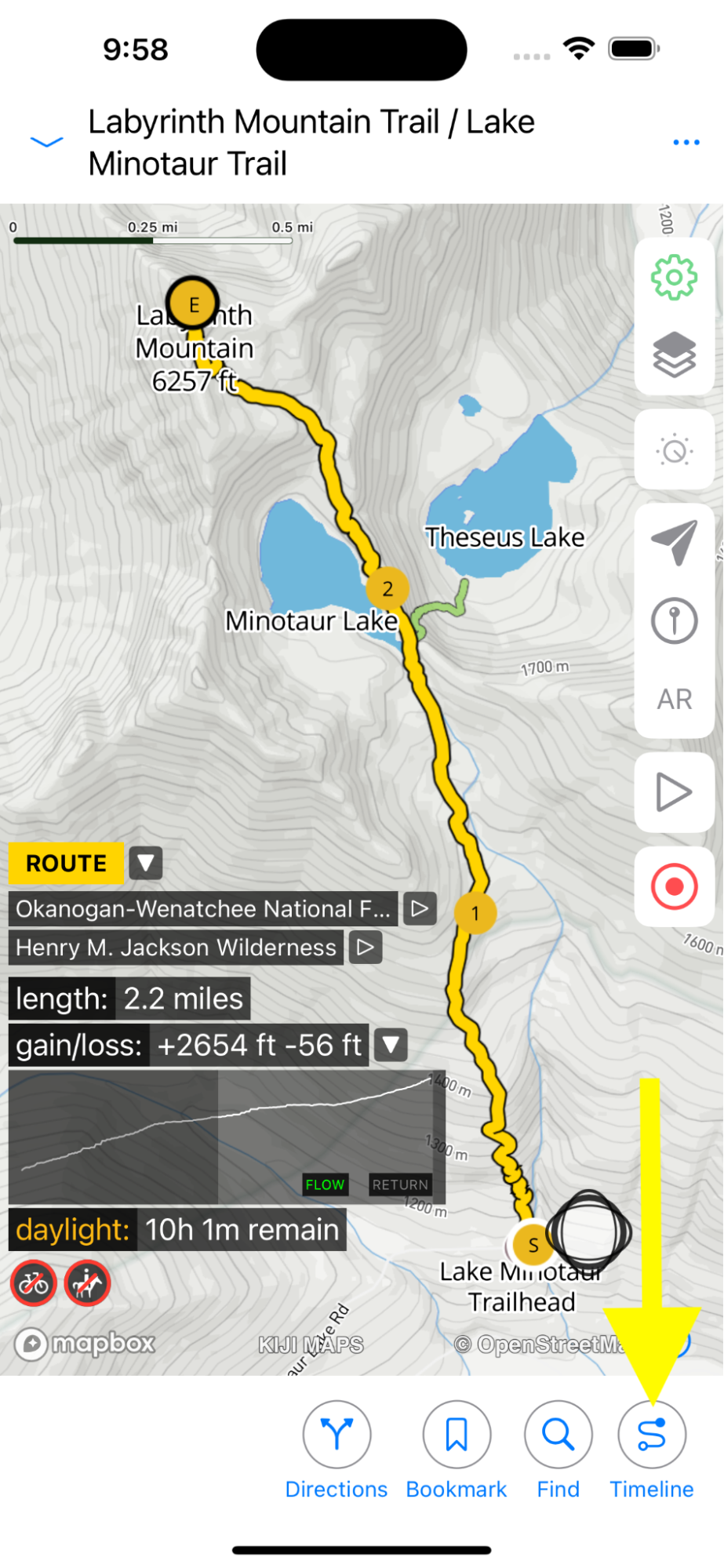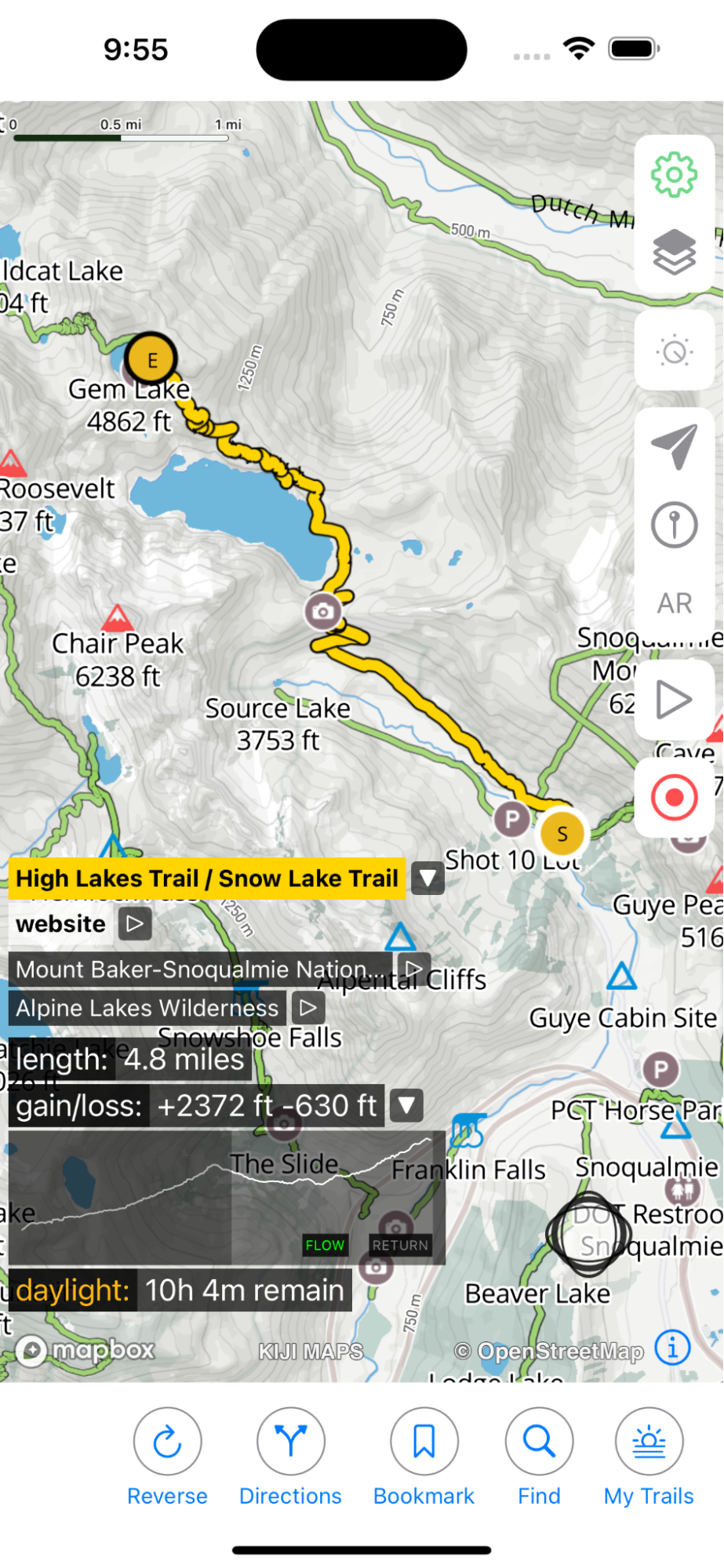 Explore the mapExplore the map and interact with it Stats will be displayed for any selected feature e.g. for a trail it will show you how long it is, what park it is in (if applicable), elevation gain/loss etc You can tap on the elevation chart and the stats will reflect the details for that specific location. A marker on the map will show you the selected location. |